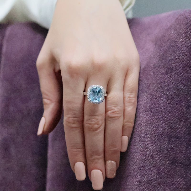 This captivating aquamarine and diamond cluster ring has been crafted from platinum and features a cushion cut Aquamarine gemstone at the centre of the band. The stone’s blue tones contrast superbly against a halo of round brilliant-cut diamonds which create a frame of light around the stone. The diamonds chosen for this ring amount to a total weight of 0.24 carats while the aquamarine stone weighs 5.11 carats.