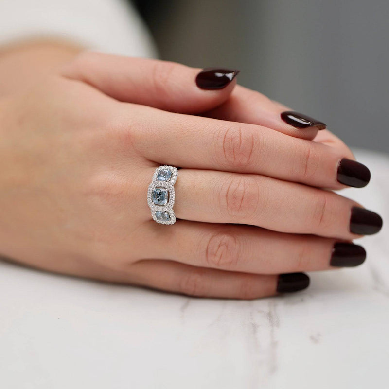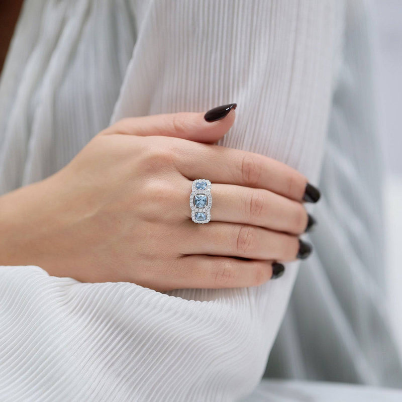 - Featuring three cushion cut aquamarine stones in four claw settings