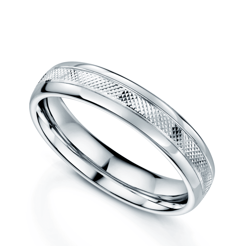 - A contemporary design featuring a criss-cross pattern running down the centre of the ring