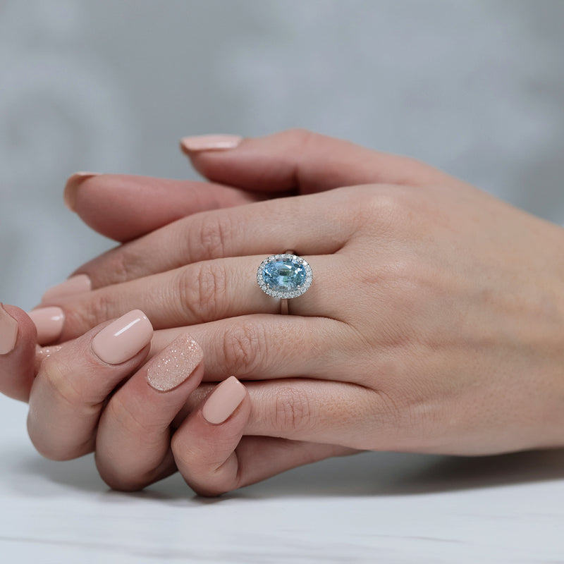 Platinum Oval Aquamarine And Diamond Halo Ring
