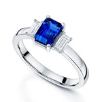 This captivating platinum tanzanite and diamond three stone ring is a truly stunning piece and an elegant choice for an engagement ring option. This elegant ring features a central emerald cut tanzanite stone in a four claw setting. This beautiful rich purple stone is accompanied on either side by a claw set baguette cut diamond. This stunning ring is crafted from high quality platinum for extra shine and durability. The tanzanite centre stone has a carat weight of 1.41ct and the two accent stones have a total carat weight of 0.42ct.