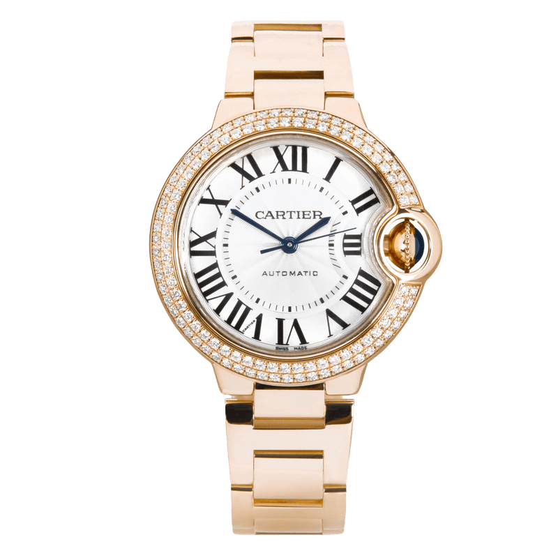 Pre-Owned Cartier Ballon Bleu 33mm 18ct Rose Gold Diamond Bezel Watch P-O WE902064 103. 18ct rose gold 33mm case and diamond bezel, all featured on a matching bracelet. This watch has a silver dial with Roman numeral hour markers and blued steel hands. Water resistant up to 30m and sapphire crystal glass. Automatic movement.