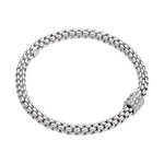 Beautiful bracelet from the Solo Collection by FOPE. A simple, chunky rope inspired chain crafted from 18ct white gold, with the brand's iconic Flex'it concealed network of springs for added comfort and flexibility on the wrist. Adorned with three rondels in a complimentary 18ct white gold finish, each adorned with round, brilliant-cut diamonds for extra glamour and sparkle. The bracelet simply slides over the hand to wear, with no need for clasps or fasteners. Effortlessly elegant, the Solo bracelet in white gold is the perfect addition to any formal or special occasion outfit. Ideal for stacking and layering with similar FOPE designs, or equally impactful worn as a statement standalone piece. The Solo 18ct white gold bracelet with diamond rondels is presented in a FOPE branded box, making the perfect luxury gifting experience for a loved one.