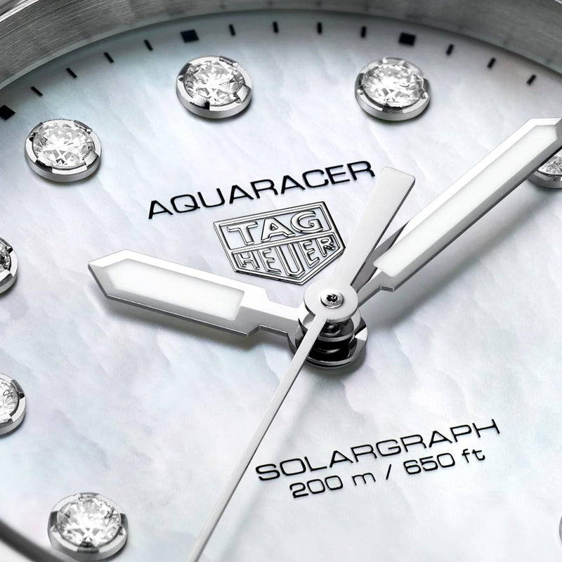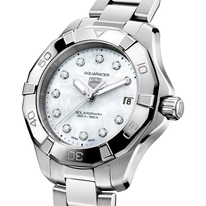 TAG Heuer Aquaracer Professional 200 Solargraph 34mm Mother of Pearl Diamond Dial Watch WBP1313.BA0005. Stainless steel 34mm case and bezel all on a matching steel bracelet. This ladies watch has as a white mother of pearl dial as well as polished and luminous hands and 11 diamond set hour markers, date display at the 3 o'clock position. Sapphire crystal glass and water resistant up to 200m. Solar-powered quartz movement.
