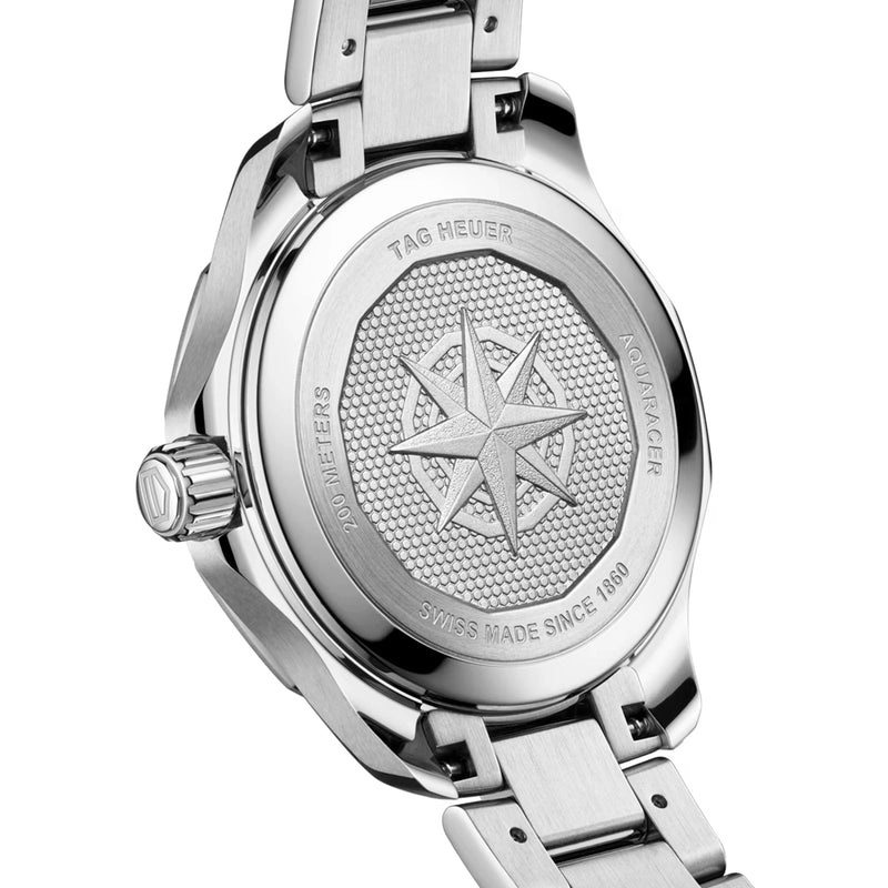 TAG Heuer Aquaracer Professional 200 Solargraph 34mm Mother of Pearl Dial Watch WBP1312.BA0005. Stainless steel 34mm case and bezel all on a matching steel bracelet. This ladies watch has as a white mother of pearl dial as well as polished and luminous hands and hour markers, date display at the 3 o'clock position. Sapphire crystal glass and water resistant up to 200m. Solar-powered quartz movement.