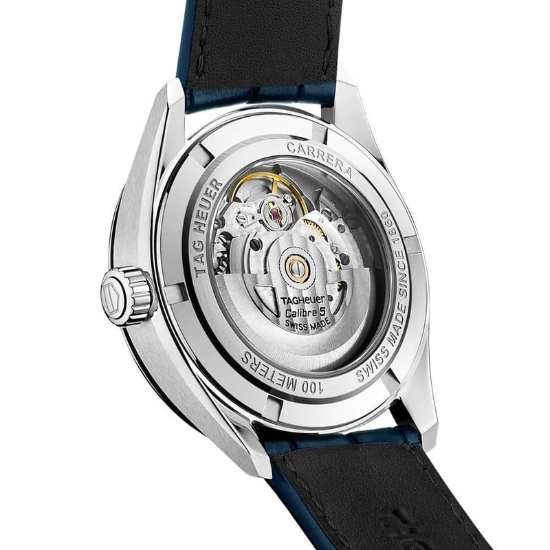 This simple three-handed time and date watch is a classic from the TAG Heuer Carrera watch range and Features a dramatic and attention-demanding blue sunray brushed dial with Super-LumiNova-coated hands and baton hour markers. A date window at 6 o’clock, dressed against a white background, balances the TAG Heuer name and logo at 12 o’clock. All elements on the dial are protected by a scratch resistant and anti reflective sapphire crystal glass front, which prevents denting, heat, moisture and light damage occurring to the display. This men’s TAG Heuer Carrera watch measures a diameter of 39mm, making it an ideal choice for those with a slender wrist. Crafted from stainless steel and integrated with 100-meter water resistance it holds the Calibre 5 at its heart, capable of providing a 38-hour power reserve. The movement can also be admired through the back of the case via a sapphire crystal glass front. This chic sporty blue and steel Carrera watch from TAG Heuer is completed on a dark blue alligator leather strap, securing with a stainless steel folding clasp.