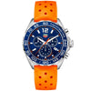 TAG Heuer Formula 1 43mm Blue/Orange Dial Men's Rubber Strap Watch CAZ1014.FT8028. Stainless steel 43mm case & blue fixed bezel all on a vibrant orange rubber strap. This men's watch has a blue sunray dial with polished and luminous applied hands & hour markers, date display at the 4 o'clock position. Sapphire crystal glass and water resistant up to 200m. Quartz chronograph movement.