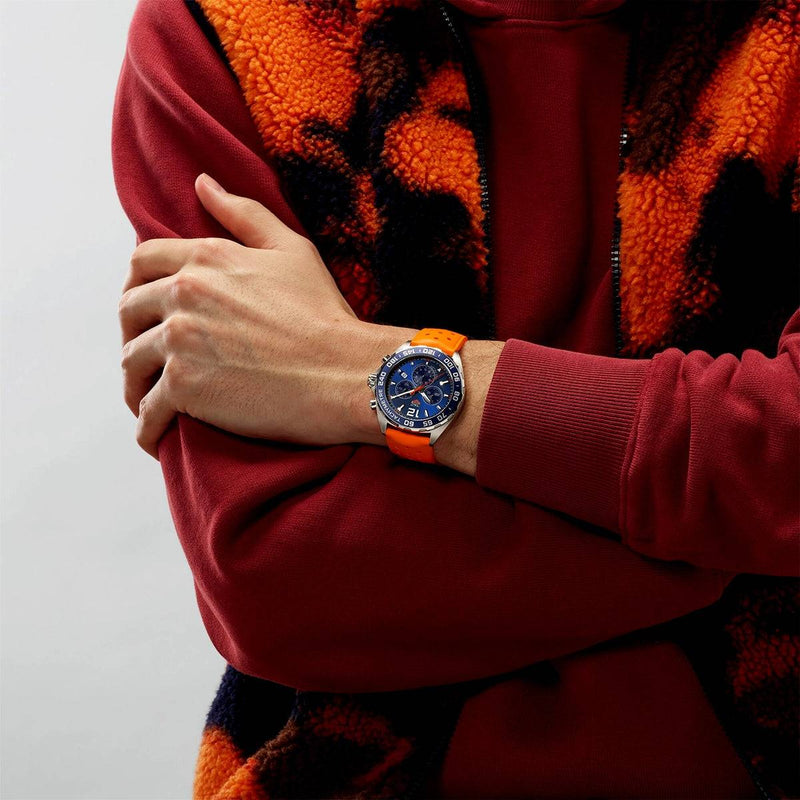 TAG Heuer Formula 1 43mm Blue/Orange Dial Men's Rubber Strap Watch CAZ1014.FT8028. Stainless steel 43mm case & blue fixed bezel all on a vibrant orange rubber strap. This men's watch has a blue sunray dial with polished and luminous applied hands & hour markers, date display at the 4 o'clock position. Sapphire crystal glass and water resistant up to 200m. Quartz chronograph movement.