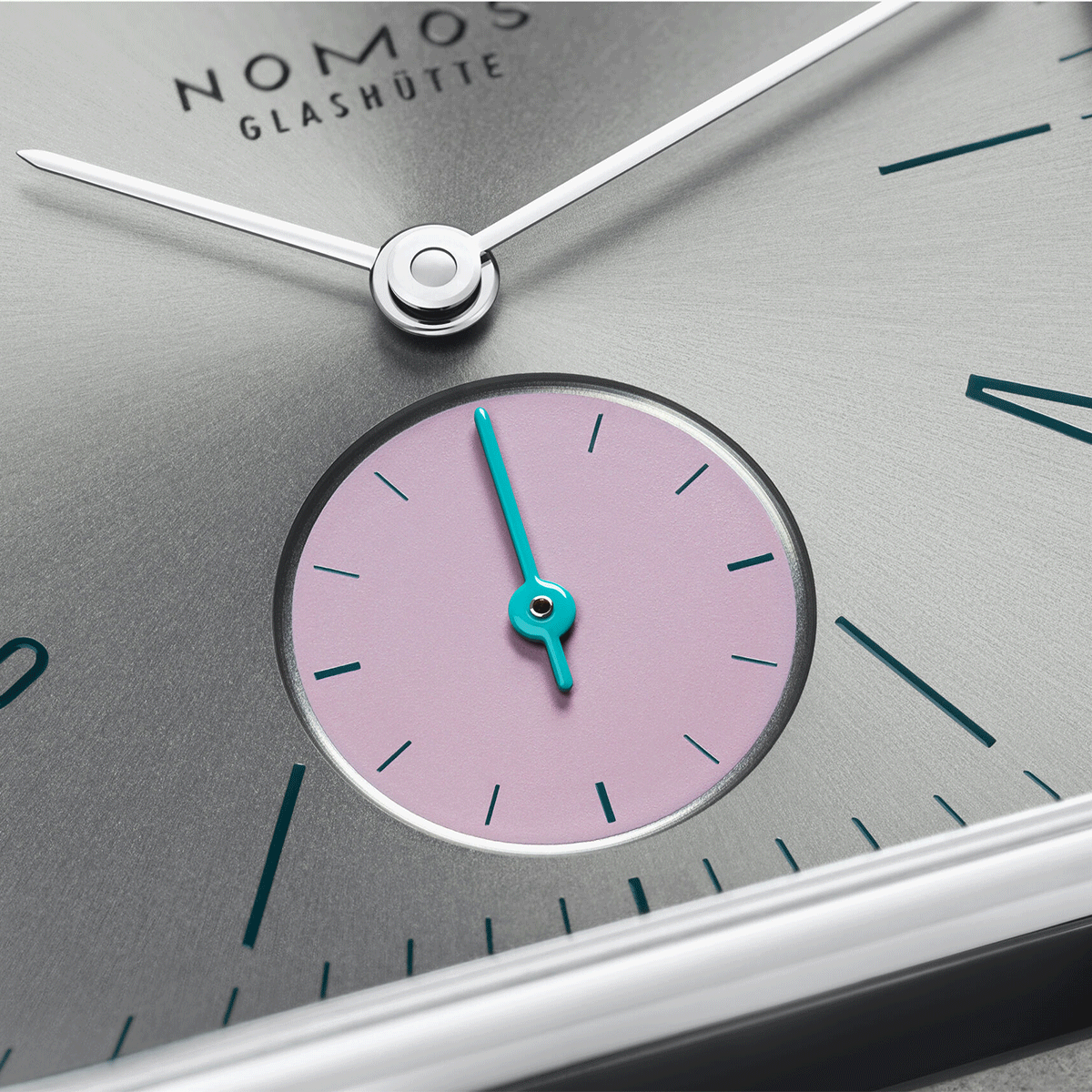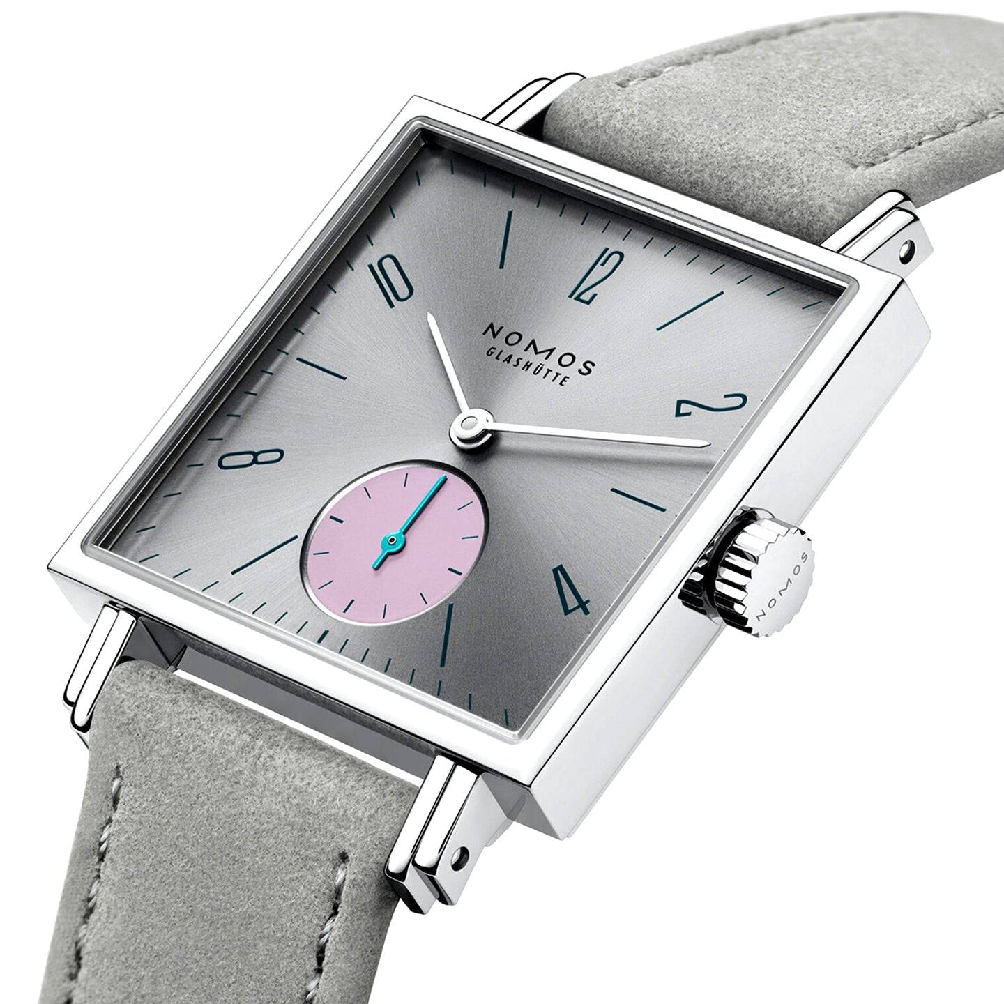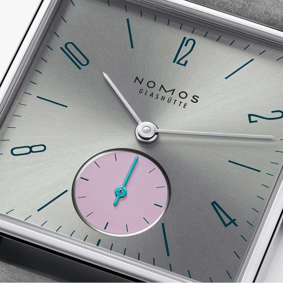 NOMOS Glashutte Tetra Die Unerreichbare 30mm Silvercut & Pink Dial Ladies Watch 477. Stainless steel 29.5mm x 29.5mm square case and bezel all on a grey velour leather strap. This watch has a silvercut polish dial with polished hands and navy hour markers, small seconds at the 6 o'clock position in pink & blue hand. Water resistant up to 30m and sapphire crystal glass. Glass case back. Manual-wind movement.