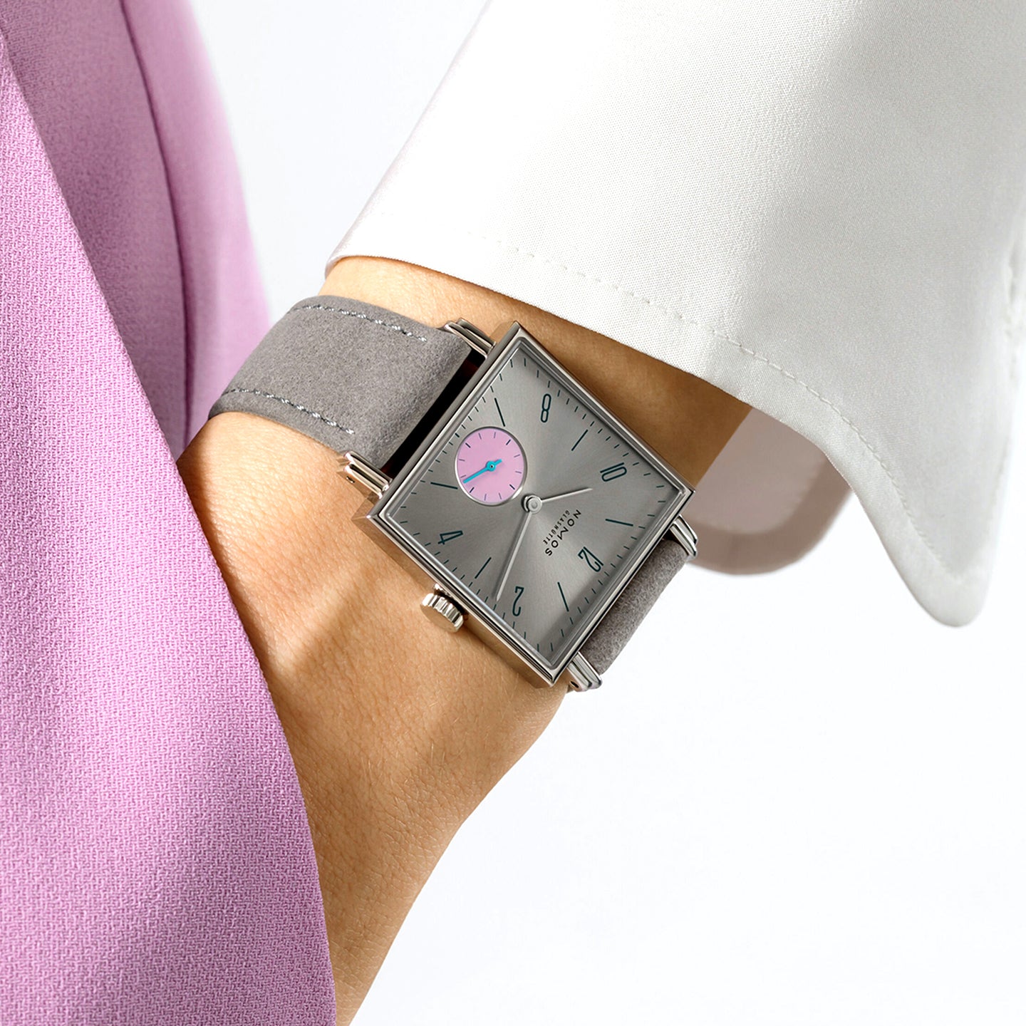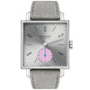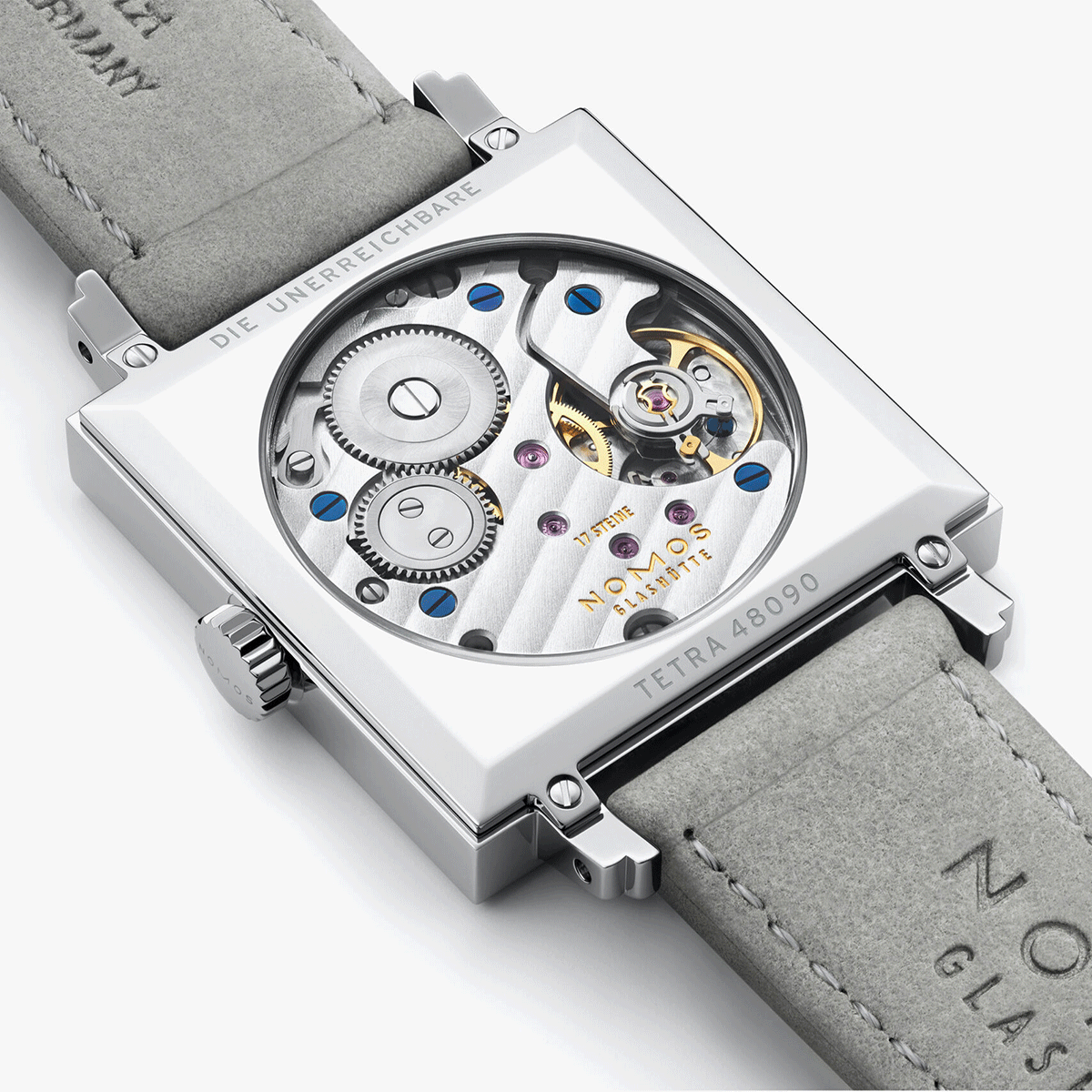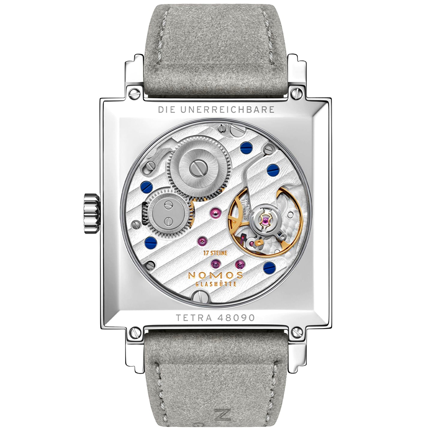 NOMOS Glashutte Tetra Die Unerreichbare 30mm Silvercut & Pink Dial Ladies Watch 477. Stainless steel 29.5mm x 29.5mm square case and bezel all on a grey velour leather strap. This watch has a silvercut polish dial with polished hands and navy hour markers, small seconds at the 6 o'clock position in pink & blue hand. Water resistant up to 30m and sapphire crystal glass. Glass case back. Manual-wind movement.