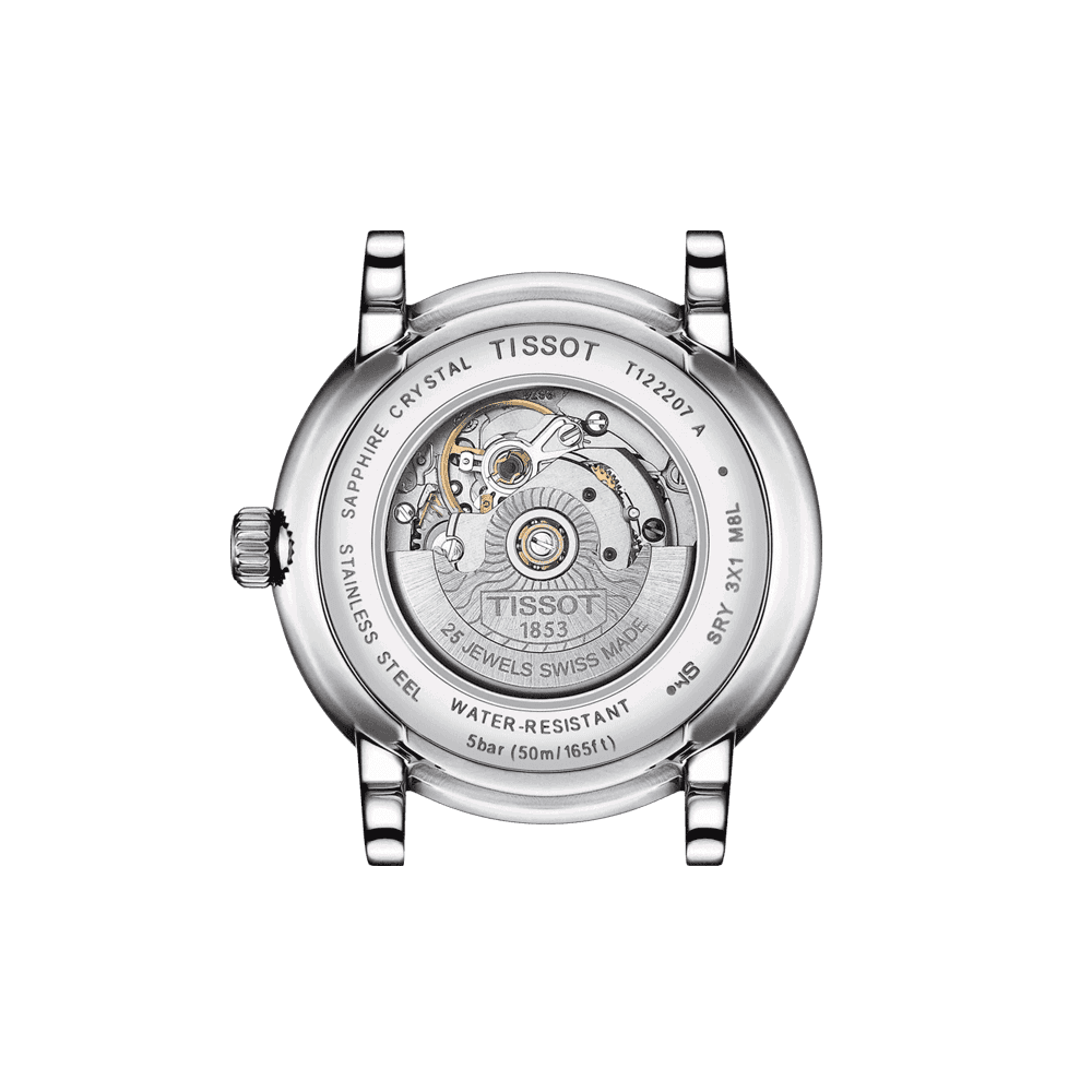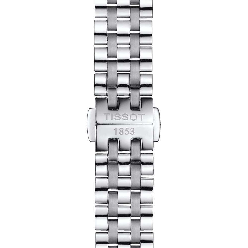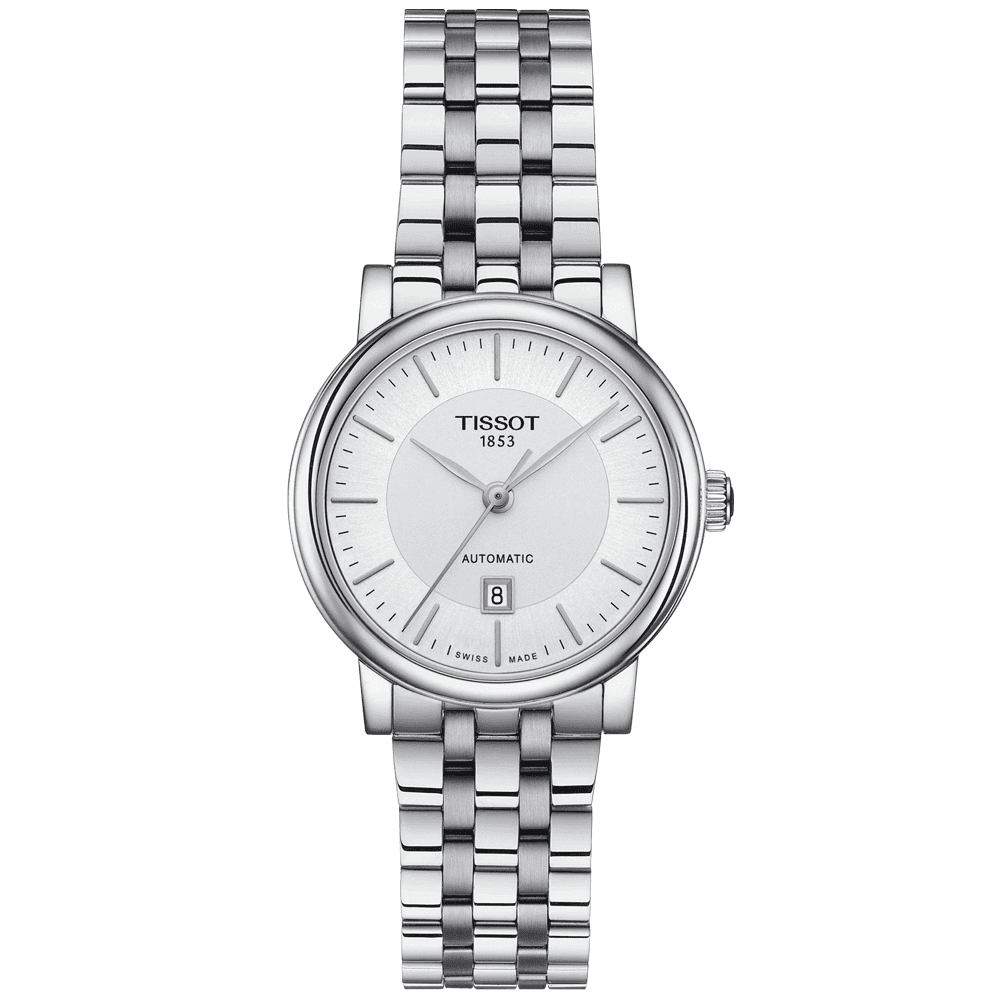 Tissot Carson Premium Automatic Lady Steel 30mm Watch - T1222071103100. Stainless steel 30mm rounded case and bezel, all featured on a matching steel bracelet with butterfly clasp and push-piece opening mechanism. This ladies watch has a silver dial with baton indexes, as well as a date display at the 6 O'clock position. Scratch resistant sapphire crystal glass and water resistant up to a total of 50 metres. Tissot 7 3/4''' movement with 38 hours of power reserve.