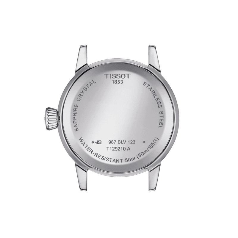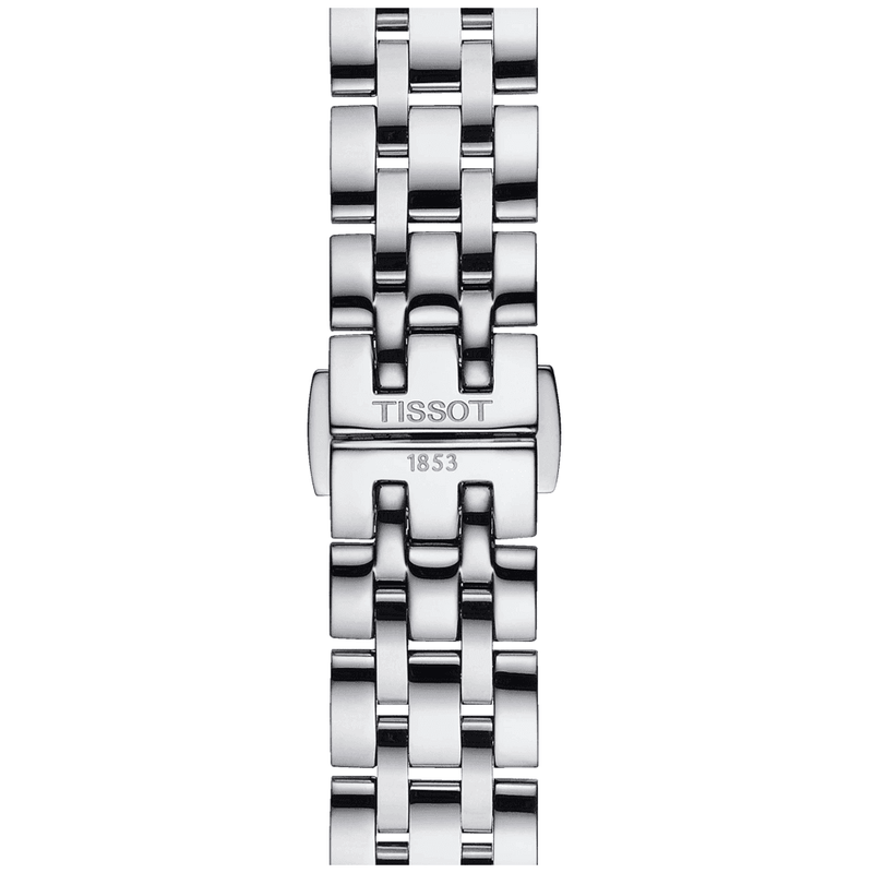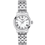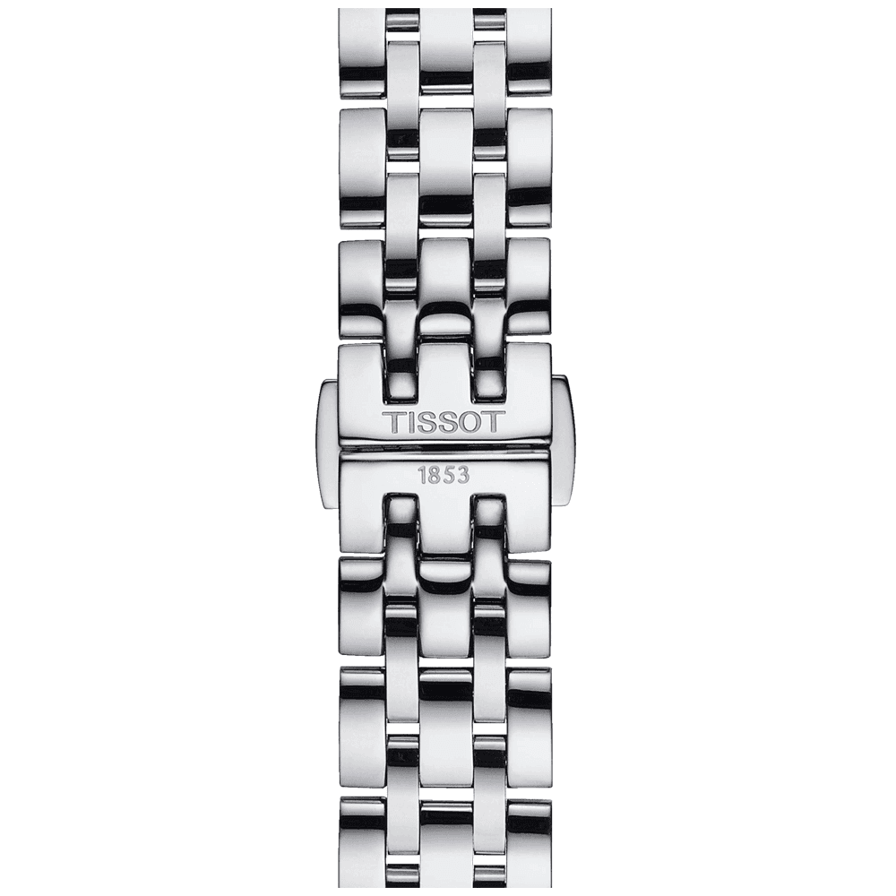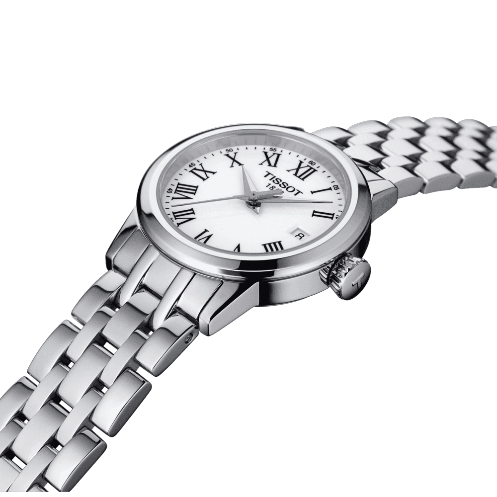 The Tissot Classic Dream Lady watch is an elegant add-on to everyday attire. Its sumptuous yet delicate design is crafted from polished stainless steel and shaped into a perfectly round profile for the slender wrist. Measuring in at 28mm in diameter, the lady’s luxury timepiece presents the time on a white dial with traditional black Roman numeral hour markers and a set of faceted central hands. Additional Features on the dial of this Tissot Classic Dream Lady watch include an outer minute track and a date window at 3 o’clock. The 50-meter water resistant watch is powered by a reliable quartz movement and Features a sapphire crystal glass front, a closed steel caseback and a polished stainless steel bracelet that secures to the wrist with a butterfly clasp and push buttons.