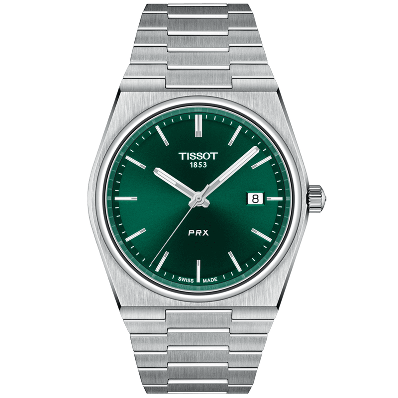 Tissot PRX Steel Men's Quartz 40mm Bracelet Watch - T1374101109100. Stainless steel 40mm rounded case and bezel, all featured on a matching steel bracelet with triple safety folding clasp. This men's watch has a green dial with baton indexes, as well as a date display at the 3 O'clock position. Scratch resistant sapphire crystal glass and water resistant up to a total of 100 metres. Tissot Quartz movement.