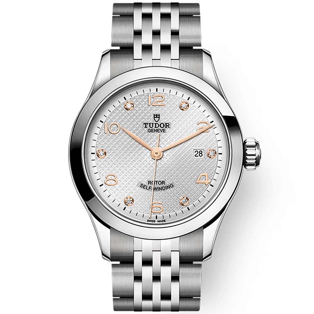 TUDOR 1926 28mm Silver/Gold Diamond Dial Ladies Automatic Bracelet Watch M91350-0003. Stainless steel 28mm case and bezel all on a matching stainless steel bracelet. This ladies watch has a textured silver dial with golden hands and 6 diamond hour markers, date display at the 3 o'clock position. Waterproof up to 100m and sapphire crystal glass. Power reserve up to 38 hours. Automatic movement.