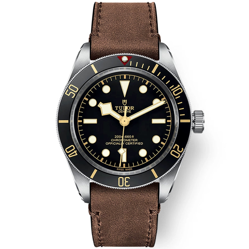 Paying tribute to their first very own diver’s watch collection, Tudor’s Black Bay Fifty-Eight watches are superbly crafted with dimensions that evoke the epoch. Despite its bold and rugged design, the Black Bay Fifty-Eight watch is tailored to suit the needs of a slender wrist. Its black dial is home to chunky hour markers and hands. Gold gilded Features on the bezel are matching with the minute scale around the flange of the watch, and an intricately crafted in-house movement powers this watch in true Tudor style. The dial is protected by a lens crafted from anti reflective and scratch resistant sapphire crystal, attached to a 200-meter water resistant stainless steel case that spans a diameter of 39mm on the wrist. Inside the watch is the self-winding Calibre MT5402 – a movement that is COSC-certified and capable of a 70-hour power reserve. The unidirectional steel bezel of this Tudor Black Bay Fifty-Eight watch is complete with black anodised aluminium 60 minute graduated scale. As well as a steel screw-down winding crown embellished with the Tudor crown logo in relief, this Black Bay watch is also completed on a stylish brown leather strap with a folding clasp and safety catch that donates a retro-inspired look to this ultra-reliable model.