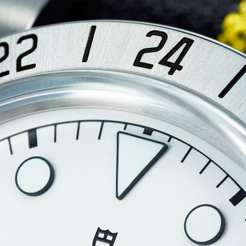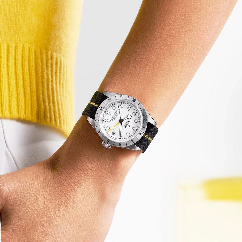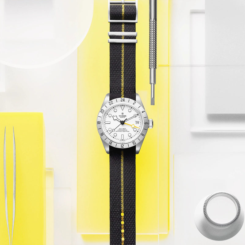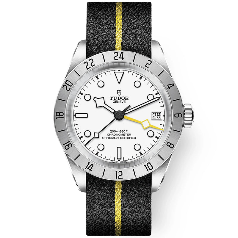 TUDOR Black Bay Pro 39mm Opaline White Dial Fabric Strap Watch M79470-0005. Stainless steel 39mm case and bezel with 24H display all on a black fabric strap with yellow detail. This watch has a opaline silver-white dial with blackened hands and hour markers, date display at 3 o'clock and yellow GMT hand. Sapphire crystal glass and waterproof up to 200m. Power reserve up to 70 hours.