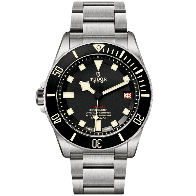 This Tudor Pelagos watch for men is powered by the impressive MT5612-LHD calibre – a self winding mechanical movement built with bidirectional rotor and a 70 hour power reserve. The movement is protected inside a 500 meter water resistant case crafted from titanium for a lightweight feel on the wrist. This diver’s watch is built for performing under dark depths of water but also looks just as stylish when paired with smart attire, thanks to its matching titanium bracelet with a folding clasp and additional diver’s extension facility, which has been designed and patented by Tudor. This broad and masculine Tudor Pelagos watch directs the wearer to the time via a dramatic black dial complete with the instantly recognisable snowflake-shaped hand which has come to be a familiar feature of the Pelagos watch line. The timepiece is equipped with a scratch resistant sapphire glass lens with anti reflective properties. The date is displayed at 3 o’clock, surrounded by an hour track with even numbers represented in red and odd numbers represented in black. The men’s diver’s watch is also completed with a titanium unidirectional rotating bezel with a rotatable 60 minute graduated ceramic matt black disc in luminescent detailing. Additional Features of the watch include a screw down winding crown adorned with the Tudor logo in relief and an automatic helium escape valve located at 3 o’clock.