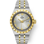 TUDOR Royal 28mm Two-Tone Silver Roman Dial Automatic Bracelet Watch M28303-0001. Stainless steel & 18ct yellow gold 28mm case and bezel all on a two-tone bracelet. This ladies watch features a sunray silver dial with golden hands and roman hour numerals as well as a date display at the 3 o'clock position. Water resistant up to 100m and sapphire crystal glass. Power reserve up to 38 hours.