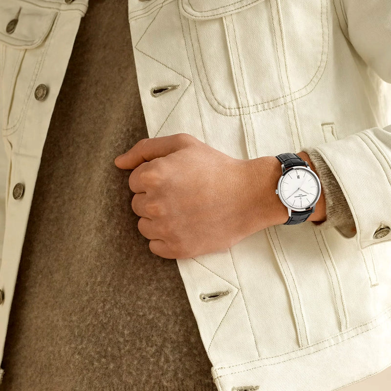 The self-winding Patrimony watch from Vacheron Constantin is an elegant and classic-looking dress watch for all occasions. Its slender profile comprises an 18ct white gold case measuring a 40mm diameter. Underneath a scratch resistant and anti reflective sapphire crystal glass front protects the surface of a silver dial adorned with lustrous central hands and slimline stick hour markers. The design of the Patrimony watch is based on earlier models from the 1950s with a gently curving case that Features a VC-engraved crown at 3 o’clock. This men’s Vacheron Constantin watch also Features a legible date window at 6 o’clock, dressed against a white background. On the reverse of the case, a sapphire crystal exhibition feature exposes a 22k oscillating weight belonging to the self-winding Calibre 2450 Q6/3. The movement performs at 28,800 vibrations per hour and provides a power reserve of 40 hours. This 30-meter water resistant Vacheron Constantin Patrimony watch is completed on a black Mississippiensis alligator leather strap with a matching 18ct white gold ardillon buckle.