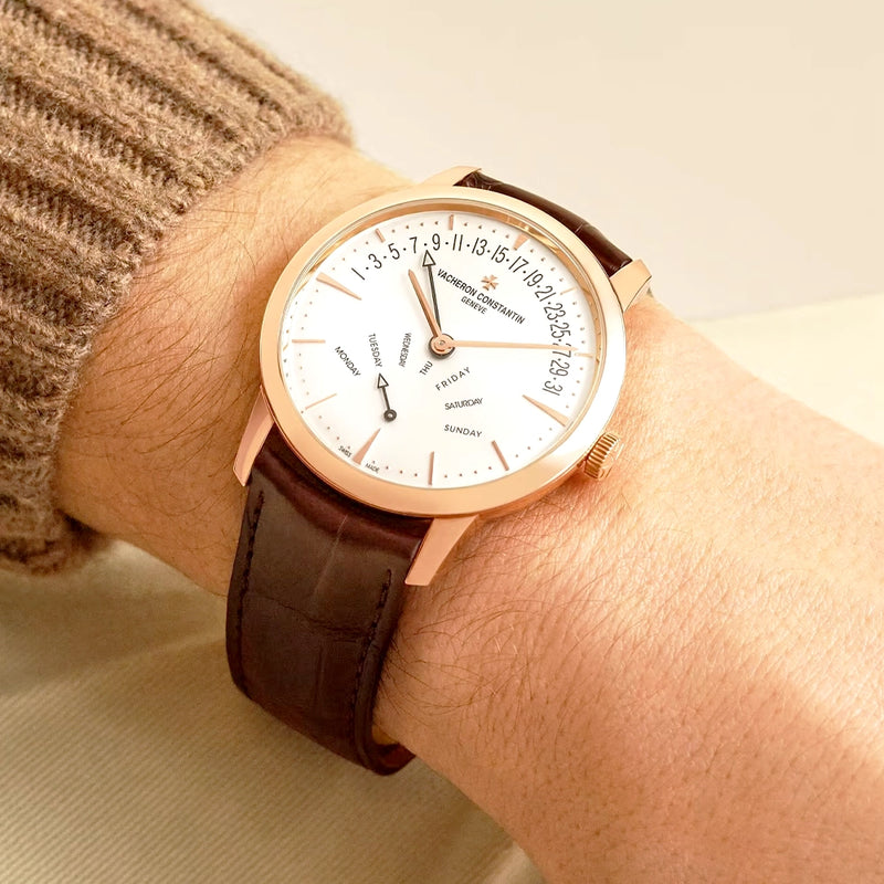 The Patrimony Retrograde Day-Date watch from Vacheron Constantin is the ideal on-the-go wristwatch that balances innovative calendrical Features with superior materials. In this design, the case of the Vacheron Constantin Patrimony watch is crafted from 18ct rose gold and measures a confident 42.5mm diameter. The 30-meter water resistant case is topped with a strong lens crafted from sapphire crystal glass to protect the surface of a sumptuous white dial with matching rose gold elements. The back of the case exposes the 2460 R31R7/2 Calibre, which comprises a total of 276 pieces and provides a 40-hour power reserve. Meanwhile, the white dial is home to rose gold stick indexes and matching hands, as well as a retrograde date display indicated by a pointer hand at the northern hemisphere of the dial, balanced by a retrograde day feature with a pointer-style hand at 6 o’clock. To complete an elegant and classic look, the men’s Vacheron Constantin Patrimony Retrograde Day-Date watch Features a dark brown Mississippiensis alligator leather strap with an 18ct rose gold deployment buckle.
