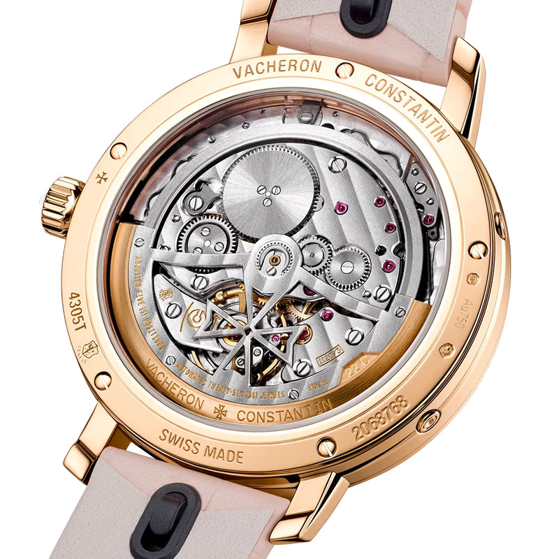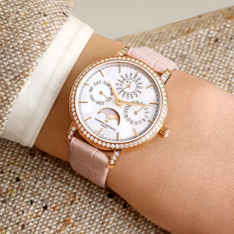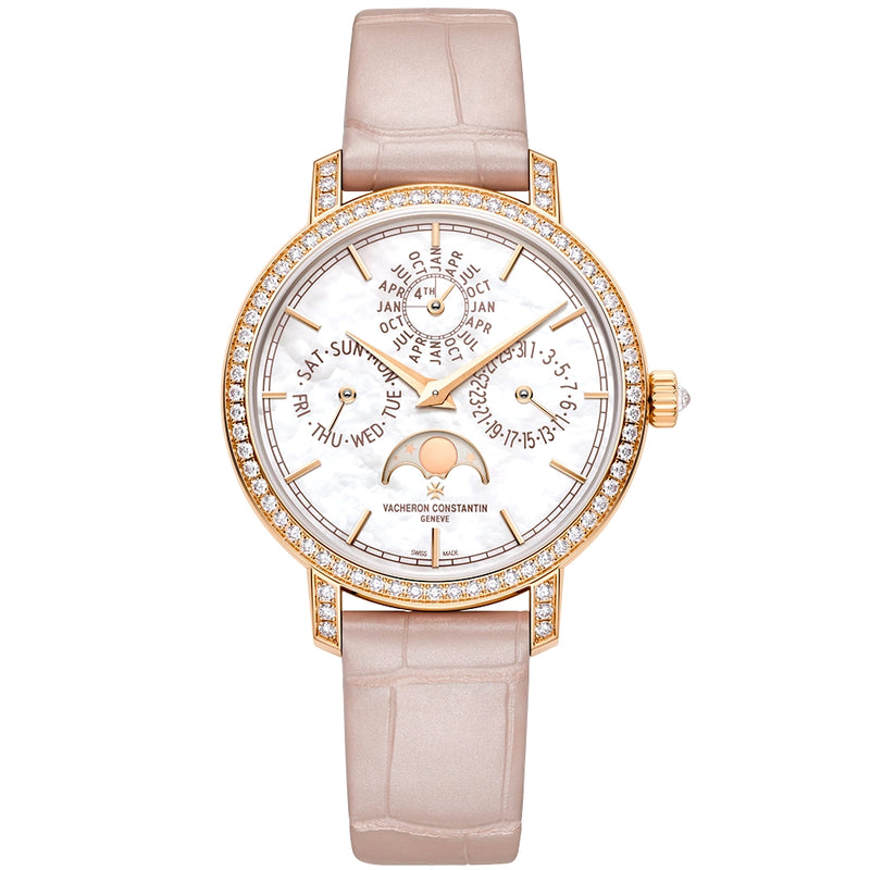 Vacheron Constantin Traditionnelle Perpetual Calendar Ultra-Thin 18ct Pink Gold Ladies Watch 4305T/000R-B947. 18ct pink gold 36.5mm rounded diamond set case and bezel, all featured on a light pink alligator leather strap with classic ardillon buckle. This ladies watch has a mother of pearl dial with sub-counters for the date, day and month, as well as a moon phase display at the 6 O'clock position. Scratch resistant sapphire crystal glass and water resistant up to a total of 30 metres. 1120 QP self-winding movement with 40 hours of power reserve.
